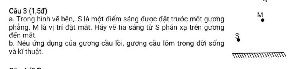 Câu 3 (1,5đ) a. Trong hình vẽ bên, S là một điểm sáng được đặt trước một gương phẳng. M là vị trí đặt mắt. Hãy vẽ tia sáng từ S phản xạ trên gương đến mắt.