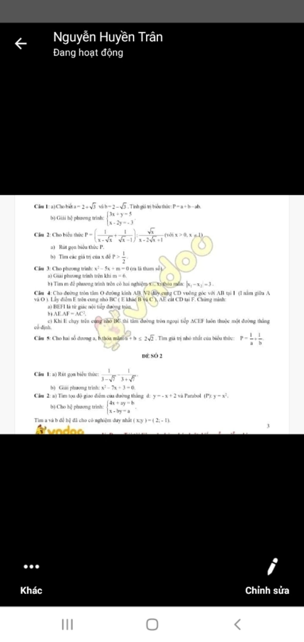 Nguyễn Huyền Trân Đang hoạt động Câu 1: a) Cho biế a- 2+5 vib-2-5. Tinh giả trị biểu thức: P-a+b-ab. [3x+y-5 x-2y--3 b) Giải hệ phương trinh: Câu 2: Cho bi
