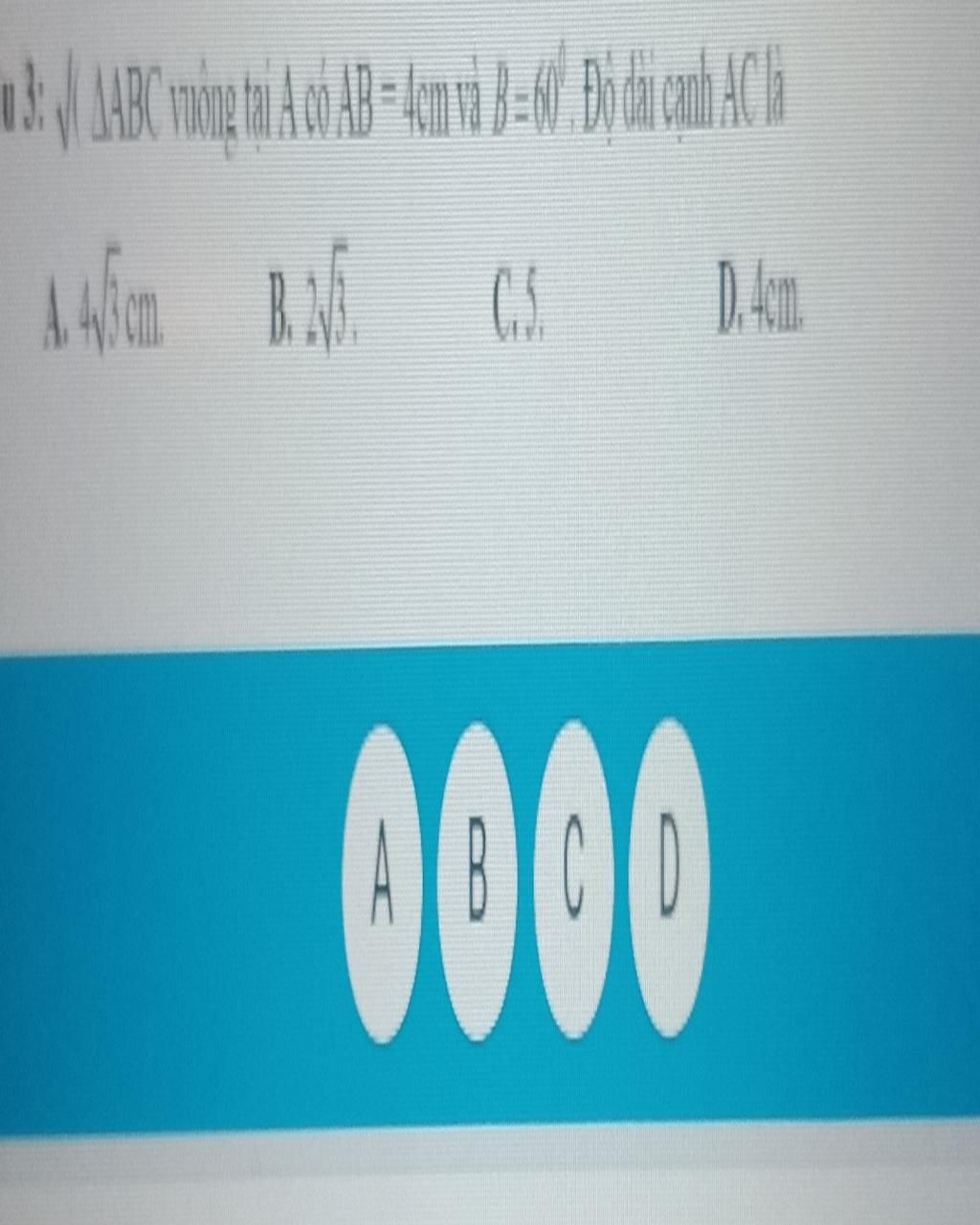 <=> AC = AB.tanB = 4 . tan60 = $4\sqrt[]{3}$