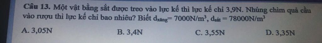 Số chỉ của lực kế khi nhúng vật chìm trong rượu là: