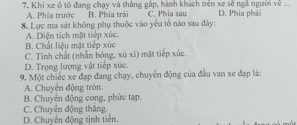 7. Khi xe ô tô đang chạy và thăng gấp, hành khách trên xe sẽ ngã người về ... A. Phía trước 8. Lực ma sát không phụ thuộc vào yếu tổ nào sau đây: A. Diện t