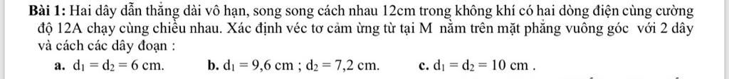 & {{B}_{1}}={{2.10}^{-7}}.\dfrac{{{I}_{1}}}{{{d}_{1}}}={{2.10}^{-7}}\dfrac{12}{0,096}=2,{{5.10}^{-5}}T \\