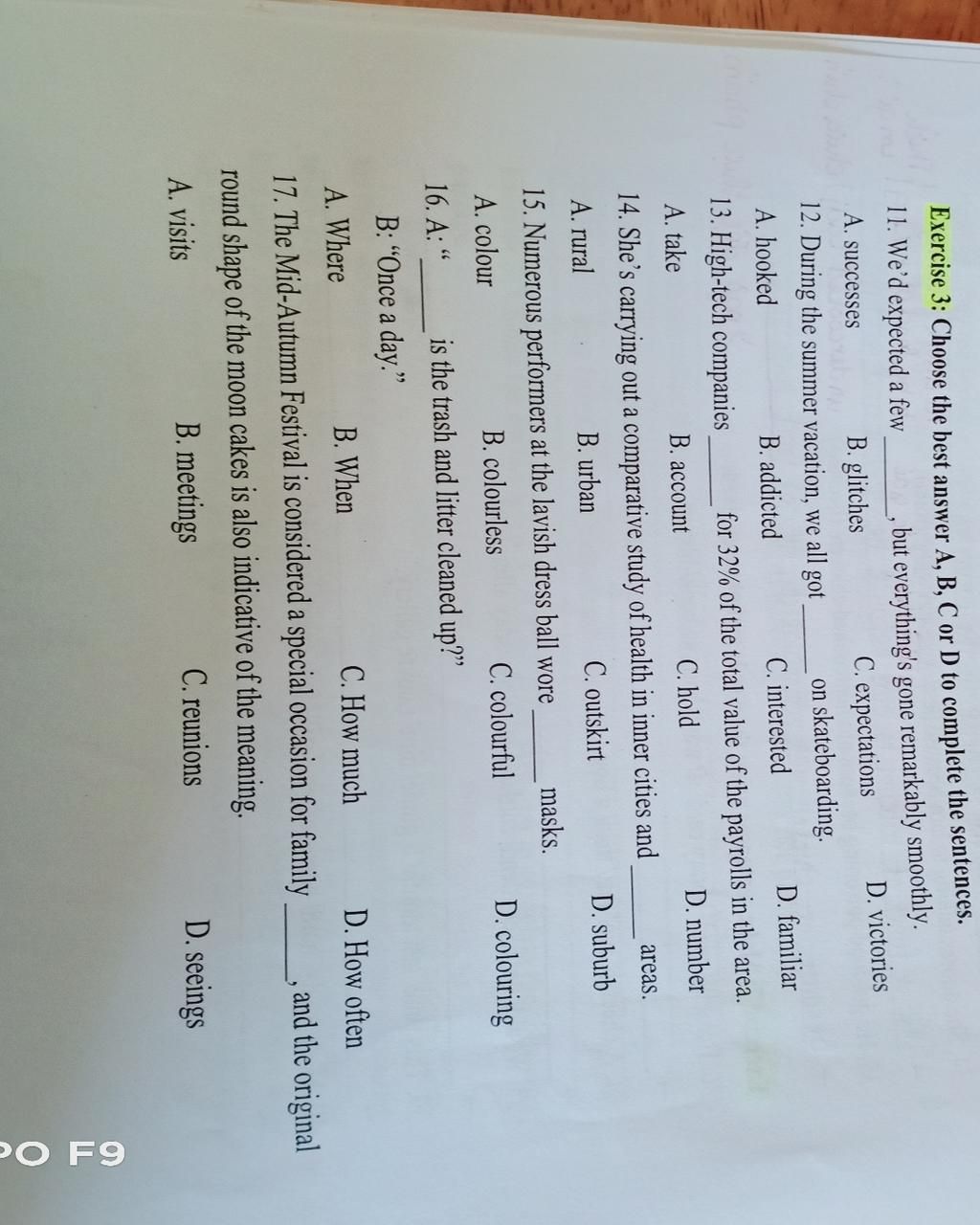 PO F9 Exercise 3: Choose the best answer A, B, C or D to complete the sentences. ,but everything's gone remarkably smoothly. B. glitches 11. We'd expected