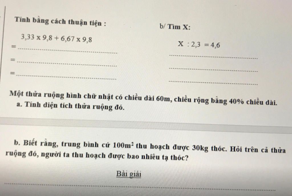 $\text{b. Trên cả thửa ruộng đó, người ta thu hoạch được số thóc là:}$