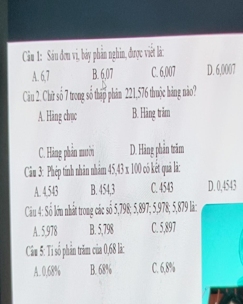 Số lớn nhất trong các số : 5,798 ; 5,897 ; 5,978 ; 5,879 là :