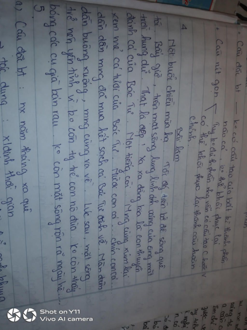 Tôi bước thông thênh trên con đường đất đỏ nơi Quảng Ngãi quê tôi. Những cơn gió mát rượi thổi qua, làm phất phơ cánh diều trước gió.(1) Những con ong vàng cần mẫn bay đi bay lại hút nhụy hoa.(2) Trước luỹ tre làng, mấy bác nông dân đang tựa lưng ngồi nghỉ, trên tay cầm chén trà nhâm nhi. Trời đã xế chiều, mọi người từ cánh đồng cũng đã rải chân về ngôi nhà của mình. Lúc đầu chỉ có một, hai người, rồi sau đó là năm, sáu người.(3) Đi thành từng hàng và nói chuyện với nhau vui vẻ. Một ngày làm việc kết thúc(4), và một ngày mới lại sắp bắt đầu ở nơi làng quê êm ấm quê tôi. Đó không phải là cảm giác dễ dàng mà có được đối với những đứa trẻ thành phố, nó gây cho ta những tình cảm ta không có, luyện những tình cảm ta sẵn có.(5)