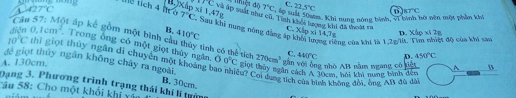 C. 22,5°C TC và áp suất như cũ. Tính khối lượng khí đã thoát ra miệt độ 7°C, áp suất 50atm. Khi nung nóng bình, vĩ bình hở nên một phần khí B.)Xấp xi 1,47g
