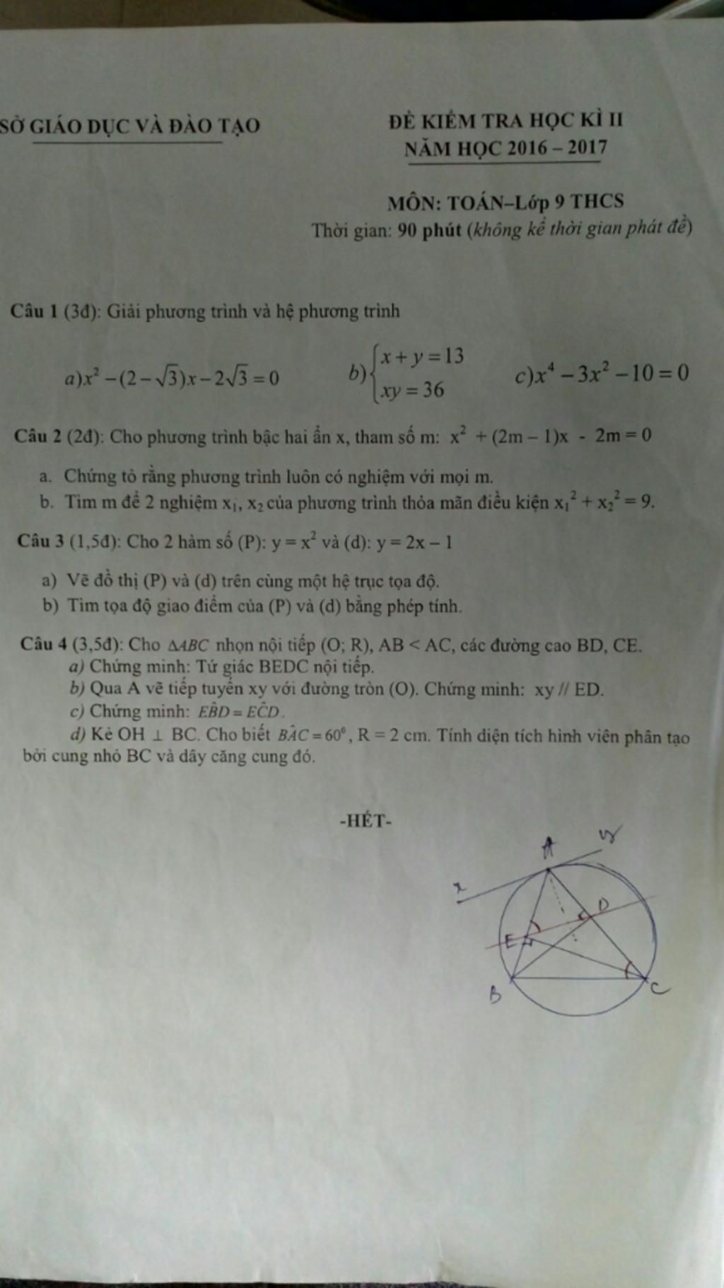 SỞ GIÁO DỤC VÀ ĐÀO TẠO ĐẺ KIỂM TRA HỌC KÌ II NĂM HỌC 2016 – 2017 MÔN: TOÁN-Lớp 9 THCS Thời gian: 90 phút (không kể thời gian phát đê) Câu 1 (3d): Giải phươ