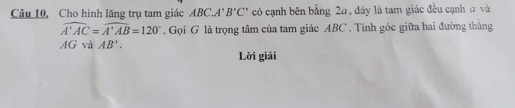 Câu 10. Cho hình lăng trụ tam giác ABC.A'B'C' có cạnh bên bằng 2a, đáy là tam giác đều cạnh a và A' AC = A' AB =120°. Gọi G là trọng tâm của tam giác ABC.