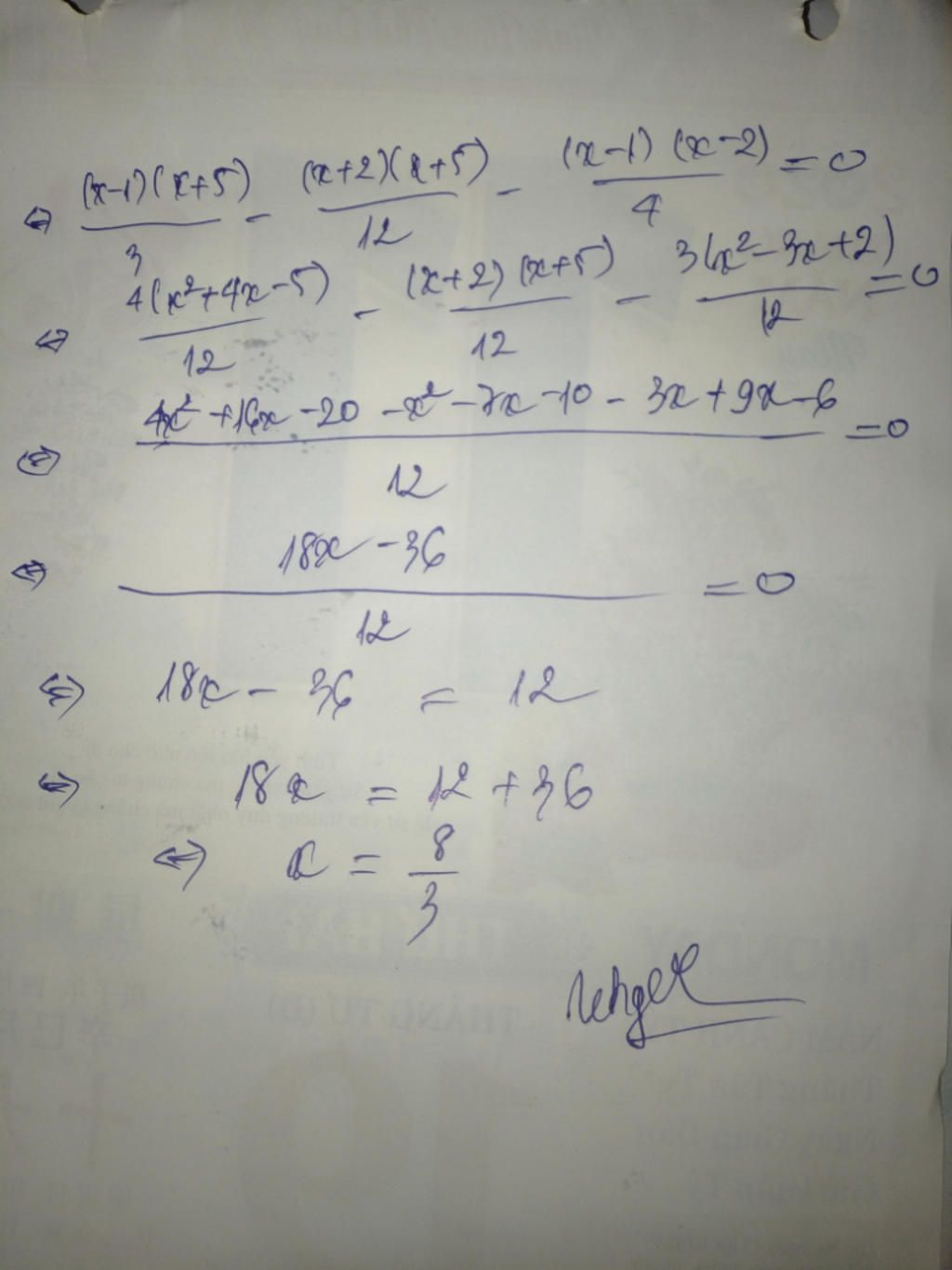 $\frac{(x-1)(x+5)}{3}-\frac{(x+2)(x+5)}{12}=\frac{(x-1)(x+2)}{4} (MC: 12)$