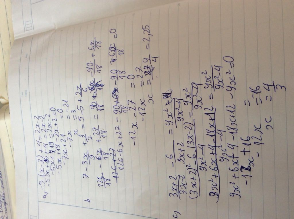 Giúp mik với mn ơi 1 a) -5( ×-3 ) + 4 = 2x-2 b) 7-3x/9 + 3/2 = 5- 5+2x/6 c) 3x+2/3x-2 - 6/3x+2 = 9x2 (-- cái này chín x bình nha ) / 9x2 (--- cái này cũg z