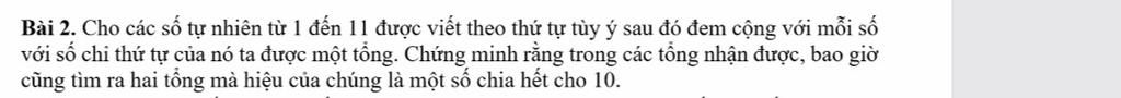 Bài 2. Cho các số tự nhiên từ 1 đến 11 được viết theo thứ tự tùy ý sau đó đem cộng với mỗi số với số chi thứ tự của nó ta được một tổng. Chứng minh rằng tr