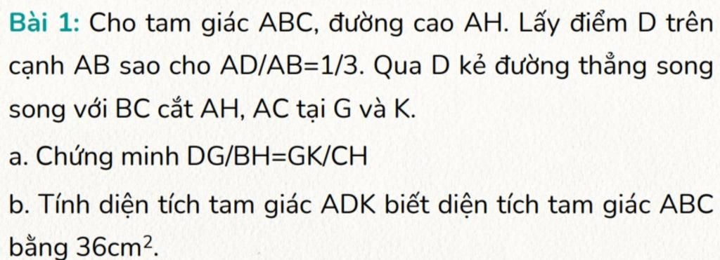 Bài 1: Cho tam giác ABC, đường cao AH. Lấy điểm D trên cạnh AB sao cho AD/AB=1/3. Qua D kẻ đường thẳng song song với BC cắt AH, AC tại G và K. a. Chứng min