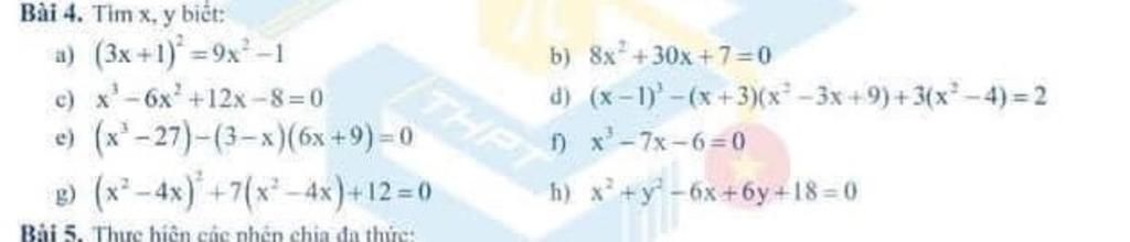 Bài 4. Tim x, y bict: a) (3x+1) =9x-1 x'-6x +12x -8=0 e) (x'-27)-(3-x)(6x +9) = 0 (x-4x) +7(x -4x)+12=0 b) 8x +30x+7=0 d) (x-1)-(x+3)(x-3x+9)+3(x-4) = 2 )