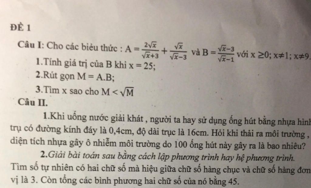 ĐÈ 1 Câu I: Cho các biểu thức : A = 2V Vz+3 và B = với x 20; x#1; x#9. V-3 Vx-3 1.Tỉnh giá trị của B khi x = 25; 2.Rút gọn M = A.B; 3.Tìm x sao cho M