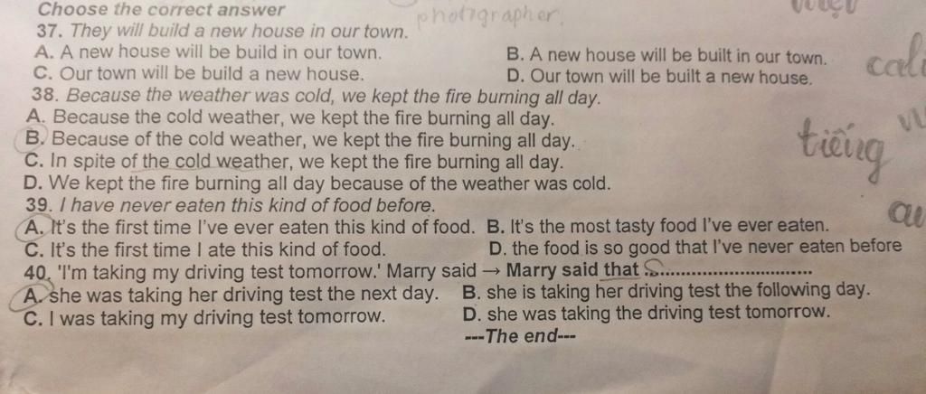 `38`. B Because of the cold weather, we kept the fire burning all day.