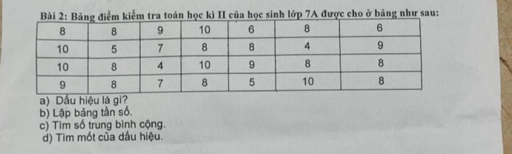 Bài 2: Bảng điểm kiểm tra toán hoc kì II của hoc sinh lớp 7A đuoc cho ở bảng nhu sau: 8. 8 6. 10 6. 8 6. 10 8 8 6. 10 8 4 10 8 8. 6. 8 7 8 10 8 a) Dấu hiệu