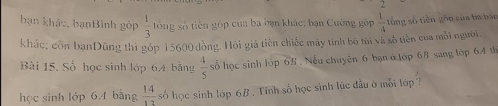 n khác, bạnBình góp teng số tiền góp cua ba bạn khác; bạn Cuờng góp - tổng số tiền góp của ba ban 3 4 Khac, còn bạnDüng thì góp i5600 dồng. Hỏi giá tiền ch