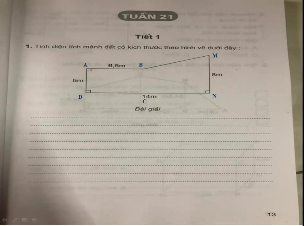 Ta chia mảnh vuờn đó thành 2 phần đất phần 1 là hình thanh vuông ABDN phần 2 là Δ BMN .