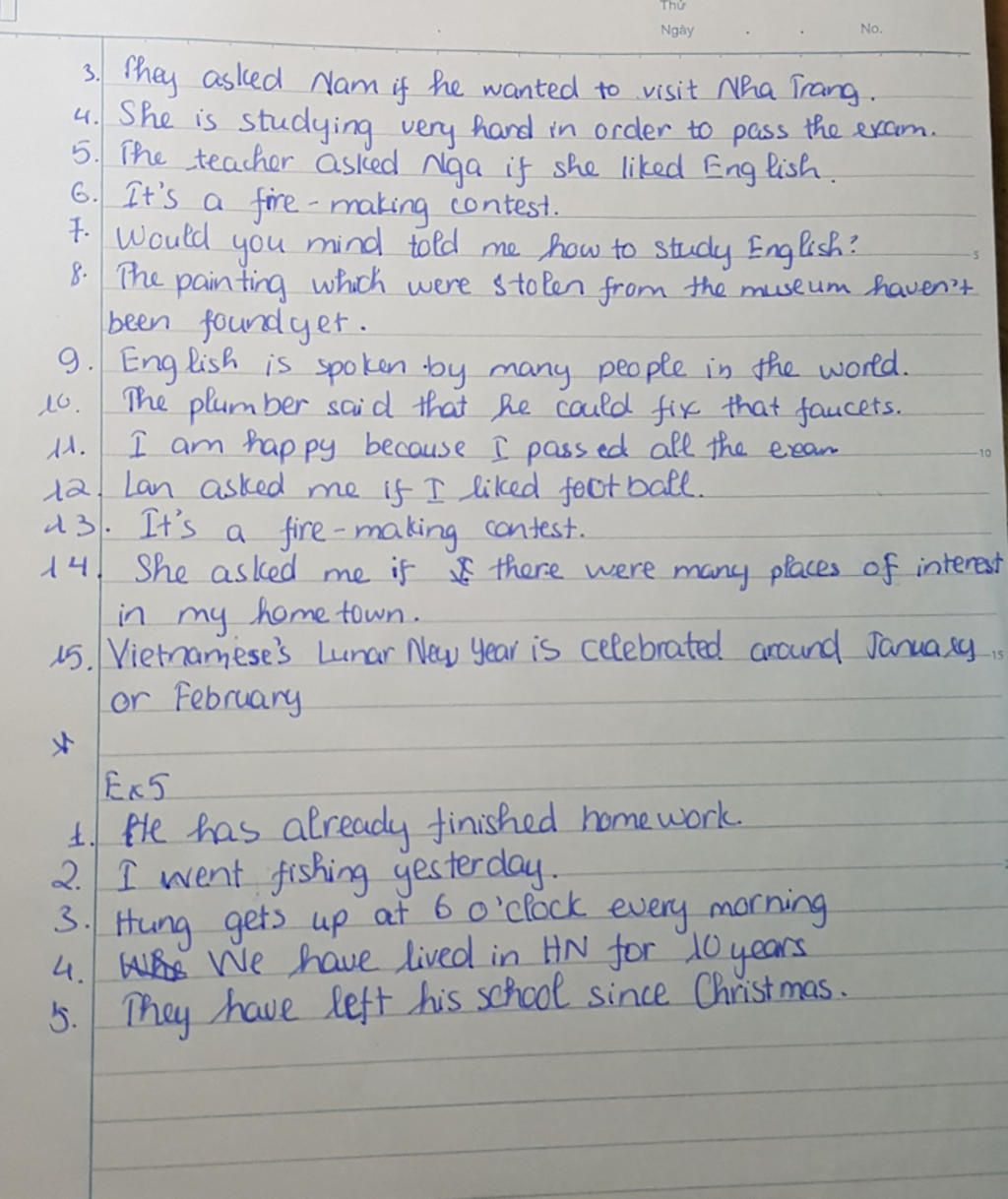 5. The teacher asked Nga if she liked English.
