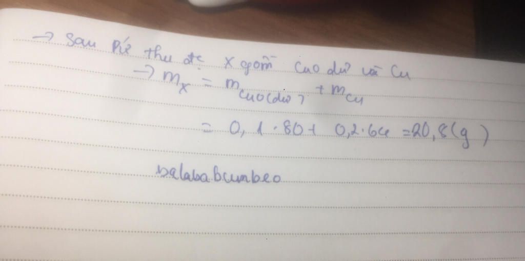 `=>n_{CuO}(dư)=0,3-0,2=0,1(mol)=>m_{Cu}(dư)=0,1.80=8(gam)`