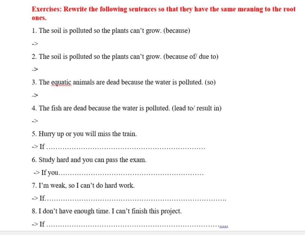 Exercises: Rewrite the following sentences so that they have the same meaning to the root ones. 1. The soil is polluted so the plants can't grow. (because)