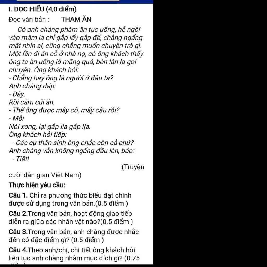 I. ĐỌC HIỂU (4,0 điểm) Đọc văn bản : Có anh chàng phàm ăn tục uống, hễ ngồi vào mâm là chỉ gắp lấy gắp để, chẳng ngẩng mặt nhìn ai, cũng chẳng muốn chuyện