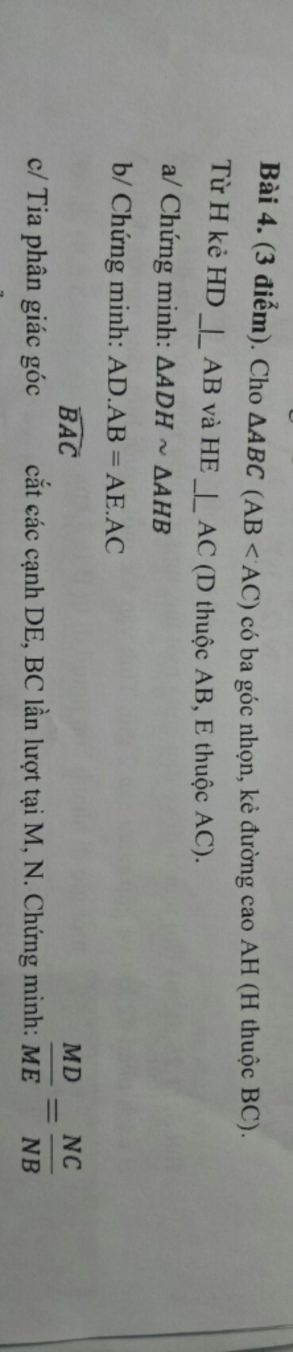 Bài 4. (3 điểm). Cho AABC (AB < AC) có ba góc nhọn, kẻ đường cao AH (H thuộc BC). Từ H kẻ HD_| AB và HE | AC (D thuộc AB, E thuộc AC). a/ Chứng minh: AADH