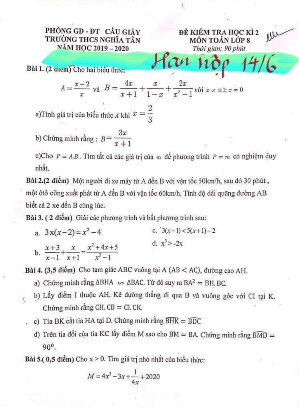 PHÒNG GD - ĐT CẦU GIÁY TRƯỜNG THCS NGHĨA TÂN NĂM HỌC 2019 – 2020 ĐÈ KIỂM TRA HỌC KÌ 2 MÔN TOÁN LỚP 8 Thời gian: 90 phút elle Han nop 14/6 Bài 1. (2 diem) C