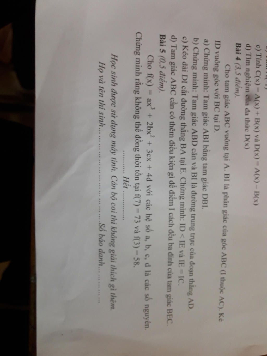 M. N lm hộ em bài 5 và câu d bài 4 vs ạ. Ai nhanh em vote 5saoc) Tính C(x) = A(x) + B(x) và D(x)= A(x)- B(x) d) Tim nghiệm của da thức D(x) Bài 4 (3,5 điểm).