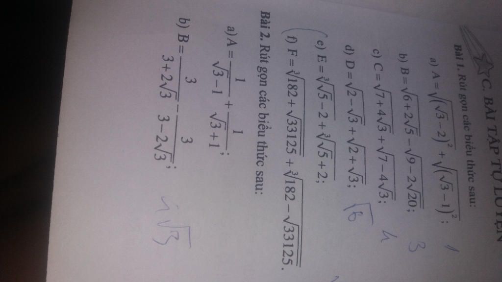 BÀI TẬP TỰ LUIỆN Bài 1. Rút gọn các biểu thức sau: )A-5-2) (5-1): / 3. b) B= V6 +2V5-/9-2/20; a) A=, c) C= 7+4V3 +V7-4/3; h d) D=2-3 + V2+ V3:6 re) E= 5-2+
