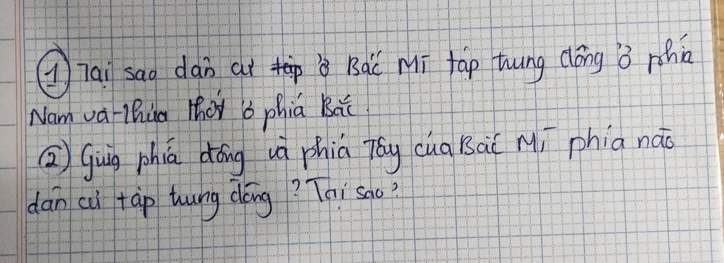 1. Dân cư Bắc Mĩ tập trung đông ở phía Nam và thưa thớt ở phía Bắc vì phía Nam có yếu tố điều kiện tự nhiên và thời tiết thuận lợi còn ở phía Bắc thì có khí hậu lạnh giá, khắc nghiệt, nhiều nơi còn bị đóng băng.