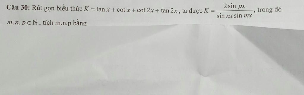 2 sin px đó Câu 30: Rút gọn biểu thức K = tan x + cot x + cot 2x+ tan 2x , ta được K = trong sin nx sin mx m.n. pEN, tích m.n.p bắăng