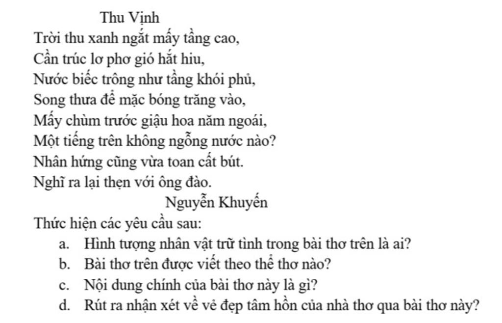 a, Hình tượng nhân vật trữ tình: Thi sĩ b. Thể thơ: Thất ngôn bát cú c. Nội dung chính: Bài thơ miêu tả cảnh mùa thu đẹp đẽ, khoáng đạt và tâm trạng của người thi sĩ khi đứng trước đất trời mùa thu. d. Vẻ đẹp tâm hồn nhà thơ: