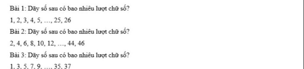 Bài 1: dãy số có 26 lượt số ( nếu các số bắt đầu từ 1 và chỉ cách nhau 1 đơn vị thiwf số lán nhất chính là số lượt số)