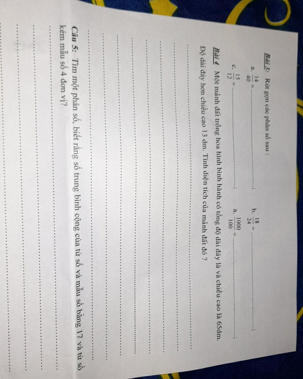 Đáp án: câu 3 :14/40=7/20 18/24= 3/4 15/12=5/4 1000/100=10/1=10