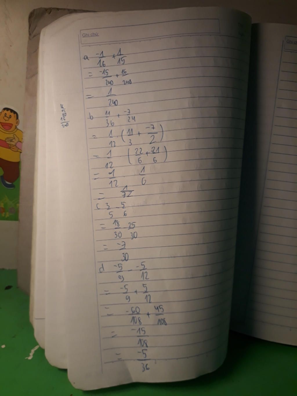-1/16+1/15 b) 11/36+ -7/24 c) 3/5- 5/6 d) -5/9 - -5/12 câu hỏi 918189 - hoctapsgk.com