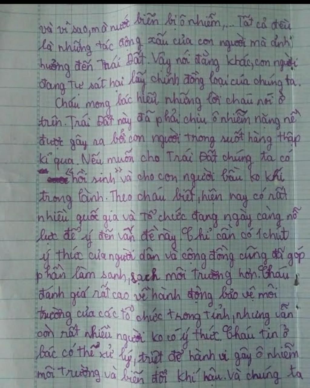 Cháu mong bác sẽ hiểu những lời cháu nói ở trên. Trái Đất này đã phải chịu ô nhiễm nặng nề được gây ra bởi con người trong suốt hàng thập kỉ qua. Nếu muốn cho Trái Đất chúng ta "HỒI SINH" và cho con người bầu không khí trong lành. Theo cháu biết, hiện nay có rất nhiều quốc gia và tổ chức đang ngày càng nổ lực để ý đến vấn đề này. Chỉ cần có 1 chút ý thức của người dân và cộng đồng cũng đã góp phần làm sanh - xạch môi trường hơn. Cháu đánh giá rất cao về hành động bảo vệ môi trường của các tổ chức trong tỉnh, nhưng vẫn còn rất nhiều người không có ý thức. Cháu tin ở bác có thể xử lý, triệt để hành vi gây ô nhiễm môi trường và biến đổi khí hậu. Và chúng ta sẽ cỳng nhau chung tay vì khủng hoảng khí hậu, vì hướng đến sự tốt đẹp của Trái Đất này.