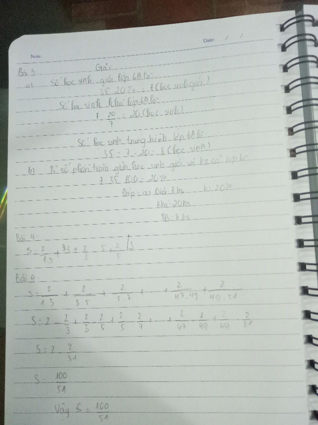 1) tính A) -5 -1 phần 6 B) 2 phần 3 +1 phần 5 nhân 10 phần 7 C) 5 phần 8 nhân 7 phần 13 + 5 phần 8 nhân 9 phần 13 - 5 phần 8 nhân 3 phần 13 Bài 2 tìm x A) x+5=2 B)x - 1 phần 2=-3 phần 4 C) 5 phần 2 x + 2 phần 3- 2 và 1 phần 6 Bài 3 Lớp 6A có 35 học sinh gồm 3 loại giỏi ,khá,trung bình .Số học sinh giỏi chiếm 20% số học sinh cả lớp.số học sinh khá bằng 20 phần 7 số học giỏi. A) tính học sinh mỗi loại lớp 6A B)tính tỉ số phần trăm số học sinh giỏi so với số học sinh cả lớp Bài 4 tính tổng sau S= 2 phần 1 nhân 3 + 2 phần 3 nhân 5 +2 phần 5 nhân 7+...+2 phần 47 nhân 49+2 phần 49 nhân 51