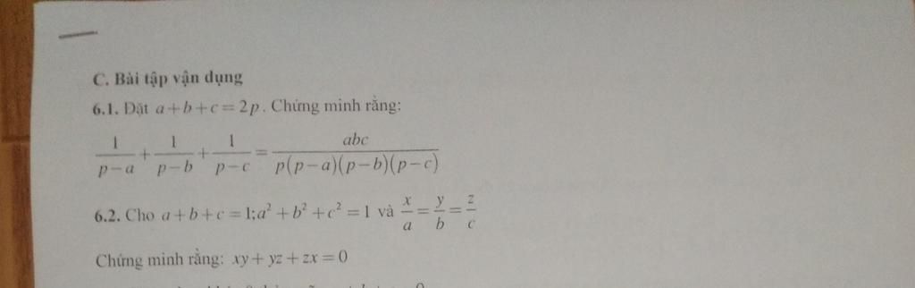 C. Bài tập vận dụng 6.1. Đặt a+b+c 2p. Chứng minh rằng: abc p-b p(p-a)(p-b)(p-c) p-a p-c 6.2. Cho a+b+c=1;a +b +? =1 và a b Chứng minh răng: xy+ yz+ zx 0