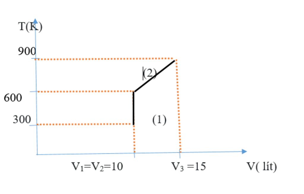 \(\dfrac{{{V_2}}}{{{T_2}}} = \dfrac{{{V_3}}}{{{T_3}}} \Rightarrow {T_3} = {T_2}.\dfrac{{{V_3}}}{{{V_2}}} = 600.\dfrac{{15}}{{10}} = 900K\)