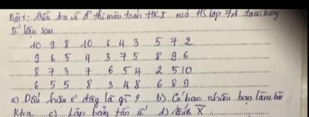 `a)` Dấu hiệu : Điểm thi môn Toán học kì `I` của học sinh lớp `7A`