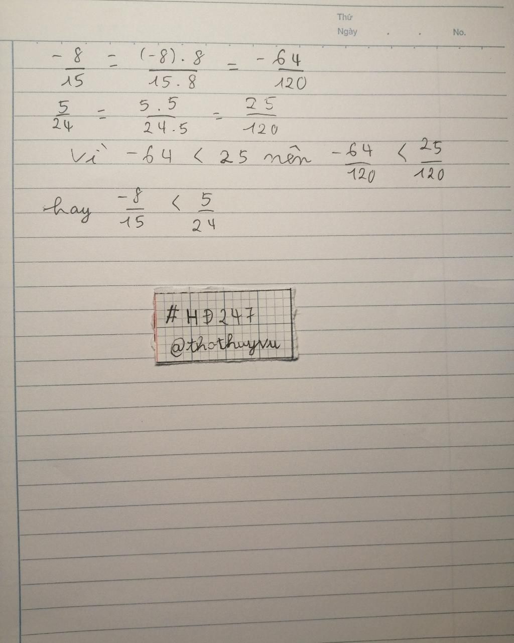 Vì `-25> -64 ` nên `(-8)/15 < 5/-24`