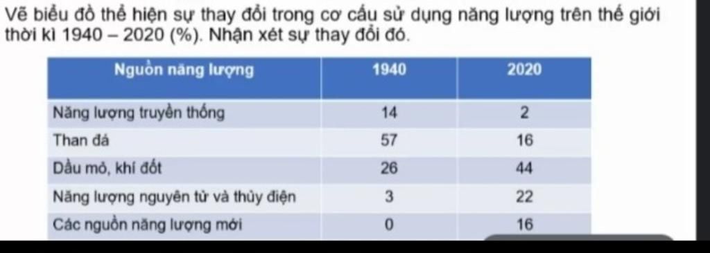 Vẽ biểu đồ thể hiện sự thay đổi trong cơ cấu sử dụng năng lượng trên thế giới thời kì 1940 – 2020 (%). Nhận xét sự thay đổi đó. Nguồn năng lượng 1940 2020