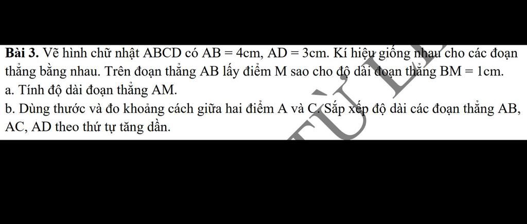 Bài 3. Vẽ hình chữ nhật ABCD có AB = 4cm, AD = 3cm. Kí hiệu giống nhau cho các đoạn thắng bằng nhau. Trên đoạn thắng AB lấy điểm M sao cho độ dầi đoạn thăn