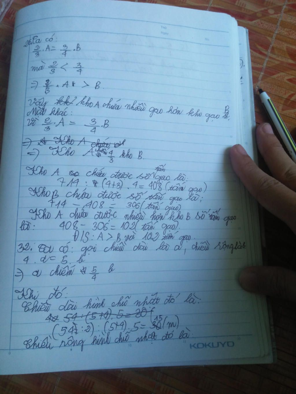 Coi số gạo kho A LÀ 8 phần thì số gạp kho B sẽ là 7 phần như thế