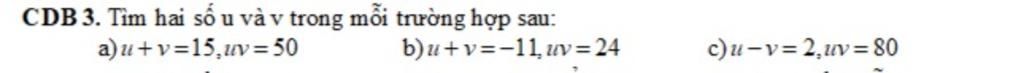 Vậy\,\left( {u;v} \right) = \left\{ {\left( { - 8; - 3} \right);\left( { - 3; - 8} \right)} \right\}\\