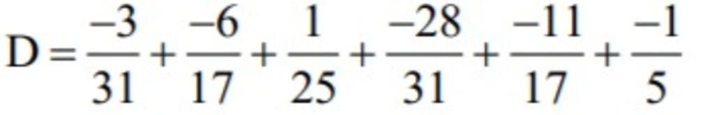 `D=(-3)/31+(-6)/17 + 1/25 +(-28)/31 + (-11)/17 +(-1)/5`
