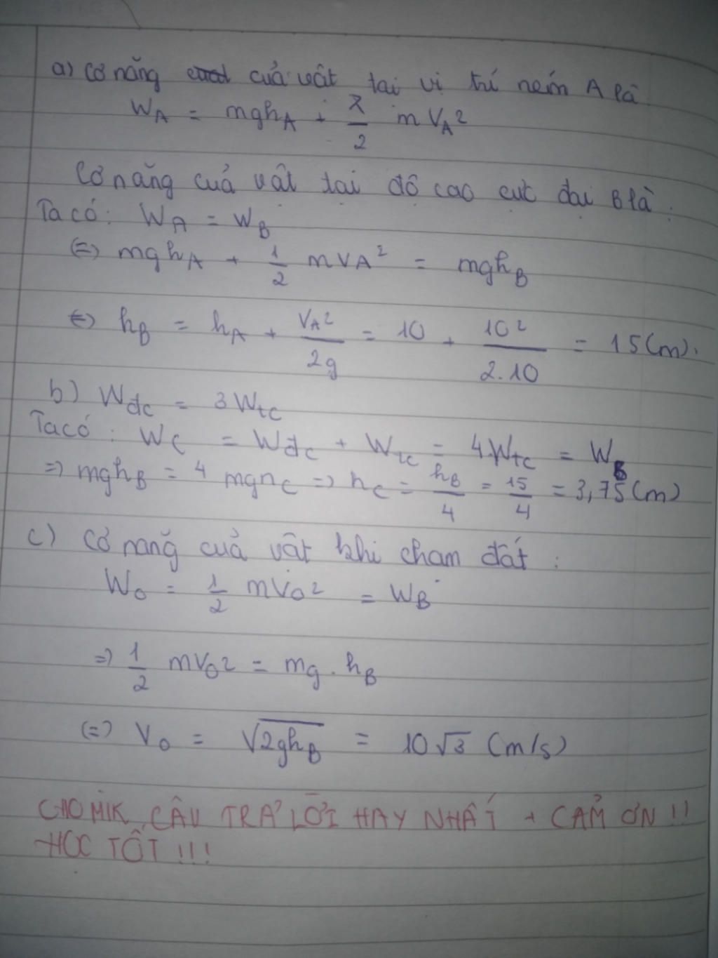 a)Cơ năng của vật lúc ném: