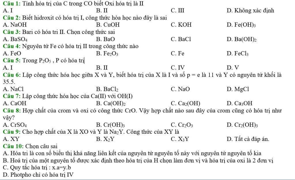 Câu 10: D. Photpho chỉ có hóa trị IV.